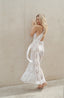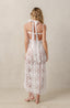 The Caoba cover-up is a sheer lace design and is the epitome of timeless beauty. This alluring cover-up boasts a graceful halter bodice with a straight long silhouette. The detail of this lace is refined and sophisticated. The long tie of the halter draped down the open back will turn heads.